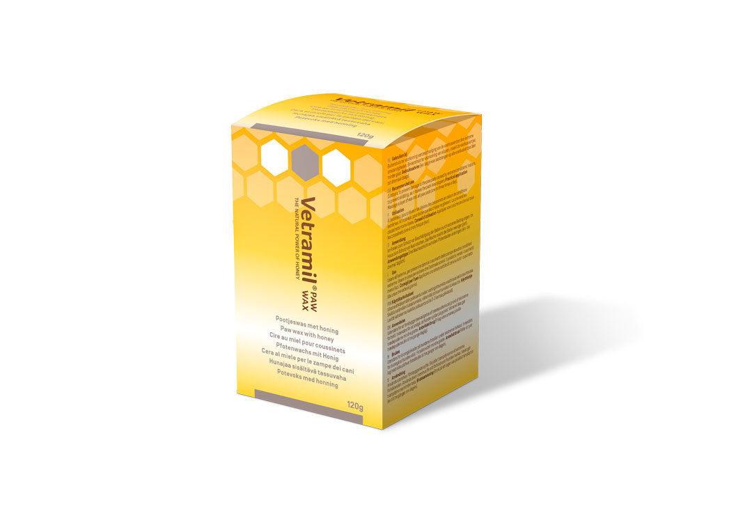 Vetramil® Paw Wax, cire de protection pour les coussinets, à base de miel. Vetramil® Paw Wax au miel a été spécialement développé pour la protection des coussinets des chiens contre les conditions extrêmes en été et en hiver telles que l’asphalte chaud, la glace, le sel, la neige et les surfaces rugueuses. Le miel riches en enzymes et la lavande contenus dans Vetramil® Paw Wax apaisent les coussinets. La cire d’abeille et l’huile d’amande créent une barrière protectrice qui maintient la santé des coussinets. Le goût amer dissuade les chiens de lécher la cire.